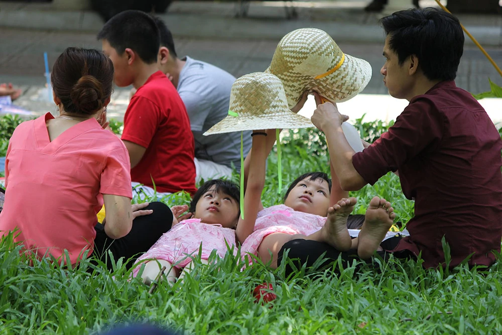 Các gia đình mang theo bạt trải trên bải cỏ để nghỉ trưa tránh nắng nóng.