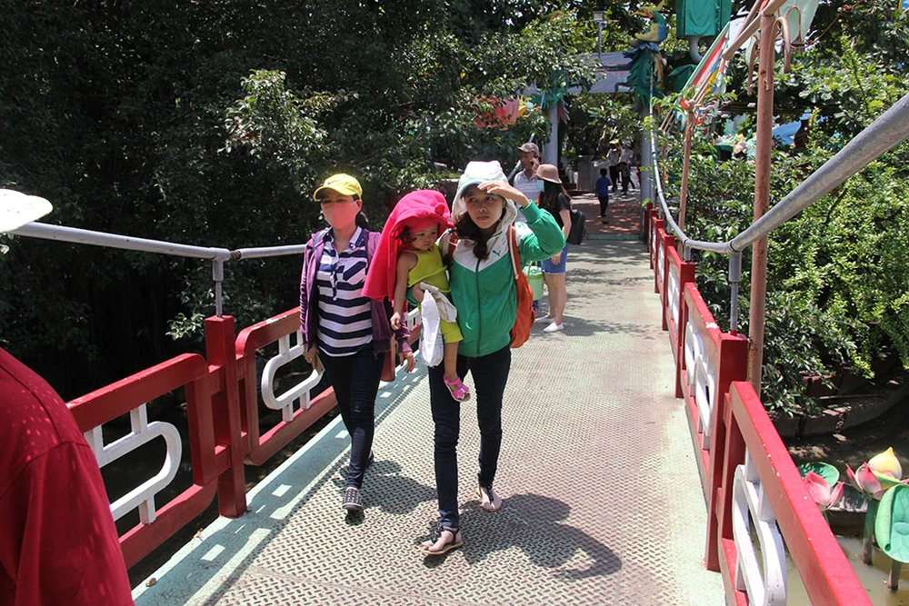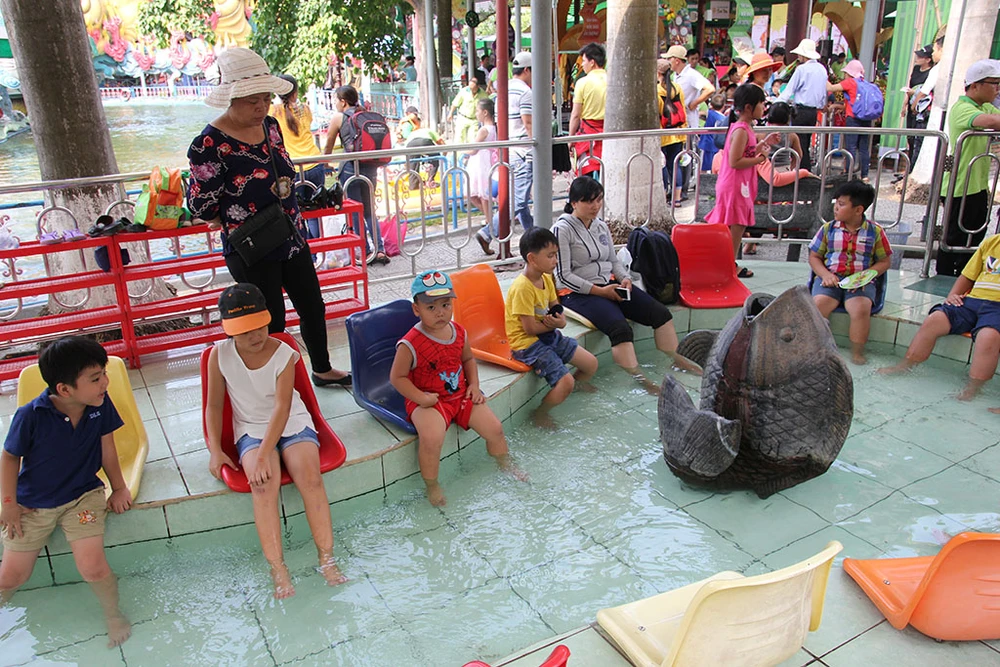 Mặc dù giữa tuần trời rất nóng, nhưng lượng khách đưa con em về khu du lịch Suối Tiên mỗi lúc một đông và ai nấy đều vui vẻ.