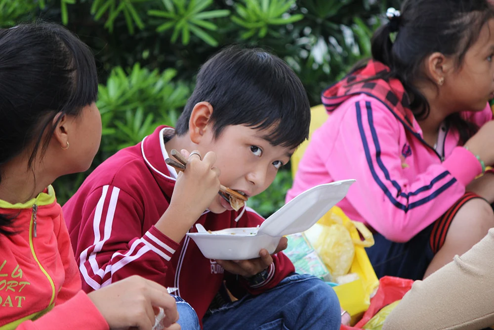 Nhiều em nhỏ chưa kịp ăn sáng phải tranh thủ ăn ngay khi vào cổng.