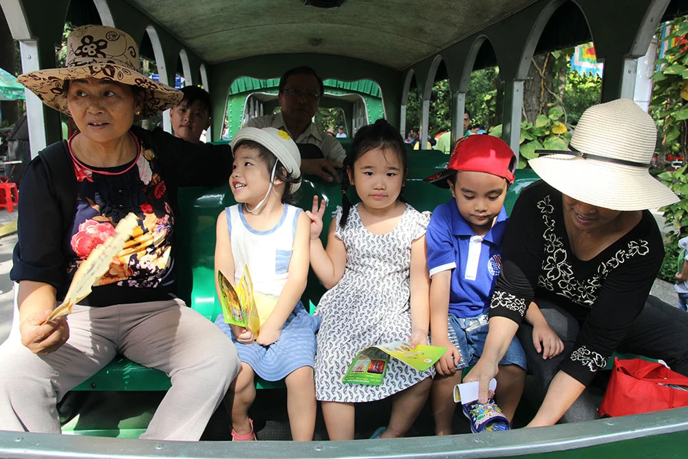 Cô Nguyễn Thị Triều (quận 9) dẫn 3 cháu nhỏ đi chơi ngày quốc tế thiếu nhi. Cô cho biết, do ba mẹ của các cháu phải đi làm nên cô dẫn các cháu đi chơi đúng dịp được miễn phí vé và có lễ hội trái cây.