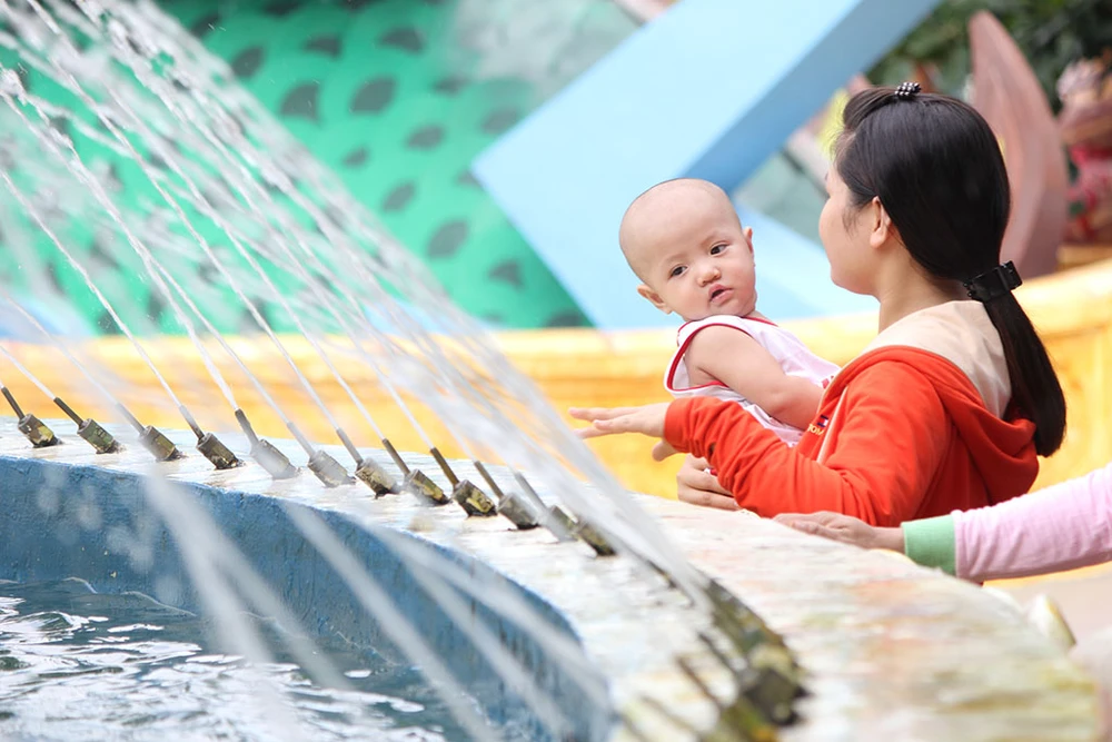 Em nhỏ thích thú khi nhìn thấy nước phun lên mặt hồ.