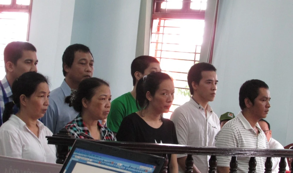 Bị cáo Thủy (áo đen)cùng các đồng phạm tại phiên tòa sơ thẩm ngày 16-11. Ảnh: N.NAM