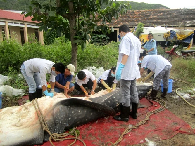 Cá nhám voi dạt vào biển Vạn Thắng và các nhà khoa học đang thực hiện các công đoạn để ướp xác