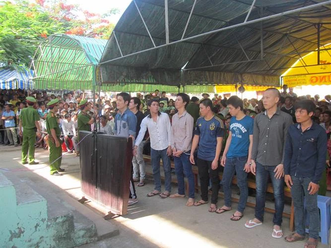 Các bị cáo tại phiên tòa xử lưu động ngày 20-5. Ảnh: CTV