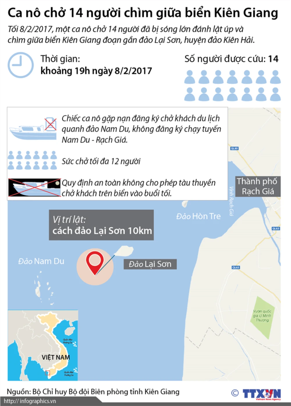 Tối 8/2/2017, một ca nô chở 14 người đã bị sóng lớn đánh lật úp và chìm giữa biển Kiên Giang đoạn gần đảo Lại Sơn, huyện đảo Kiên Hải.