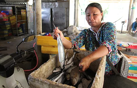 Chị Nguyễn Thị Bình (Quảng Trị) bên thùng cá không bán được trong phiên chợ buổi sáng sau thông tin vụ cá nục nhiễm chất cực độc phenol. Ảnh: Thanh Thủy