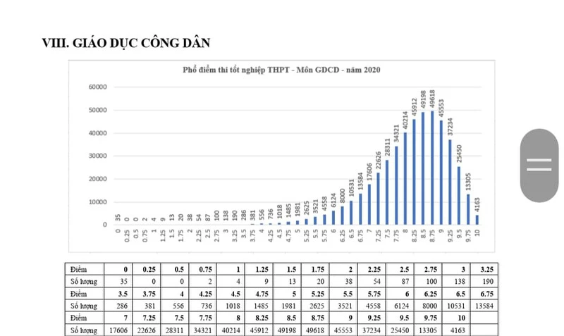 Phổ điểm môn Giáo dục công dân trong kỳ thi tốt nghiệp THPT 2020. Ảnh: Bộ GD&ĐT