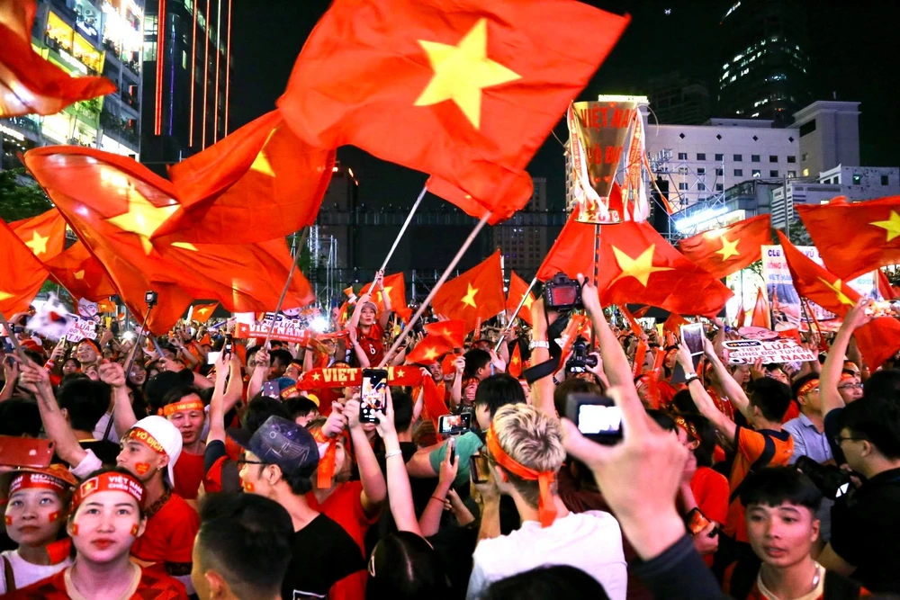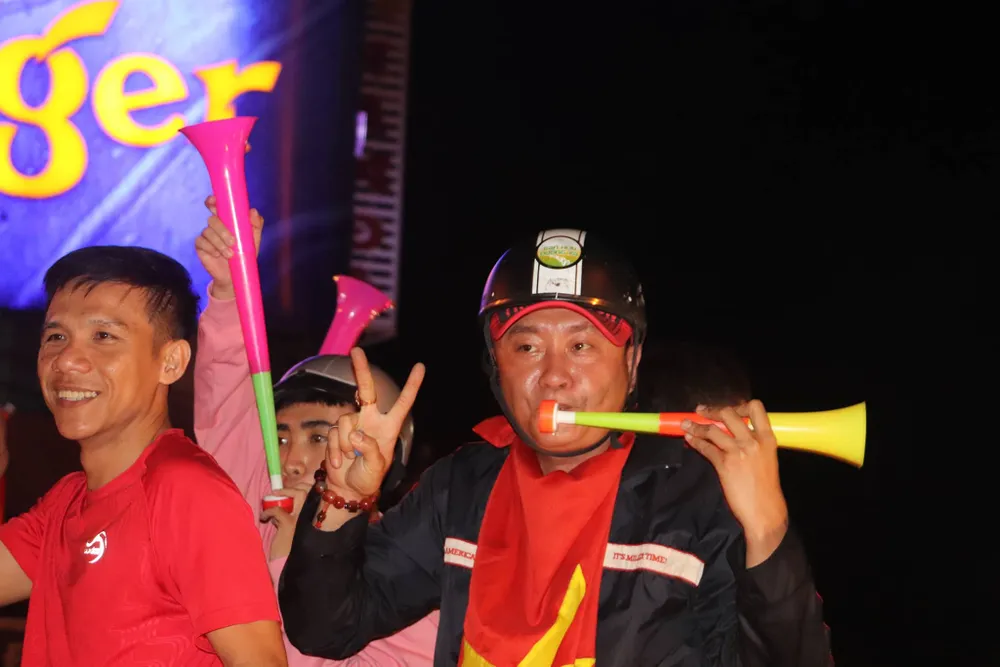 Người hâm mộ hào hứng vẫy cờ, thổi còi hô vang "Việt Nam chiến thắng!". Ảnh: HẢI DƯƠNG