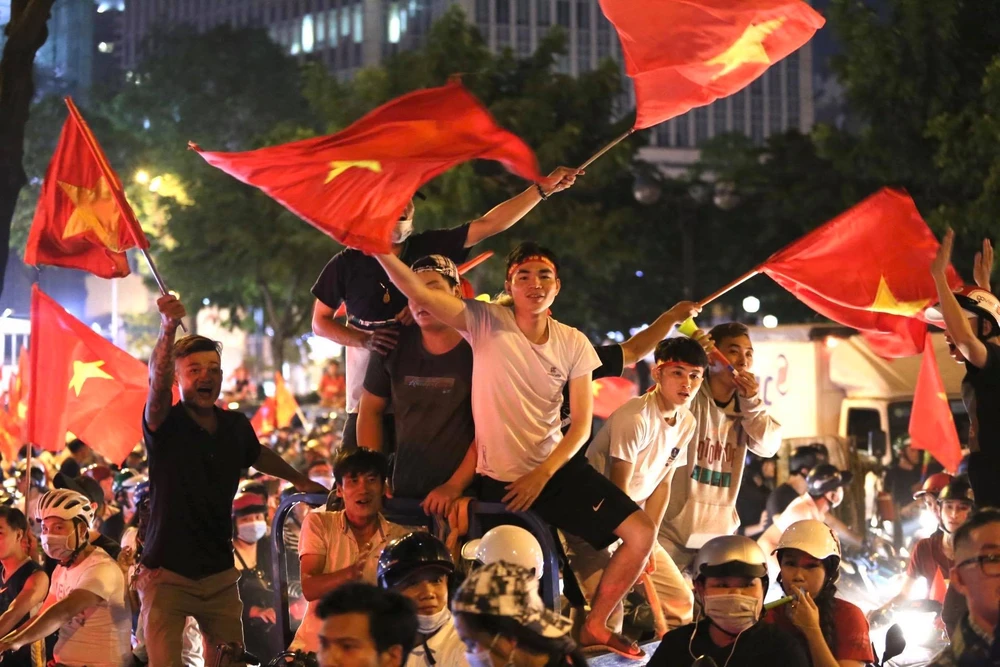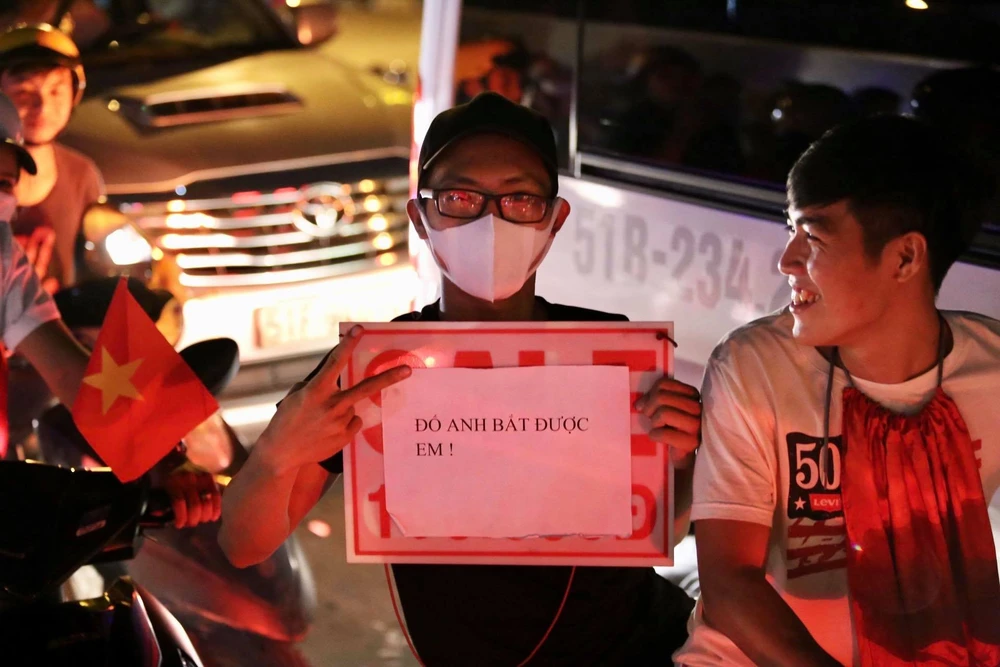 Cổ động viên đập tay ăn mừng trên đường Tôn Đức Thắng quận 1, TP.HCM. Ảnh: HOÀNG GIANG