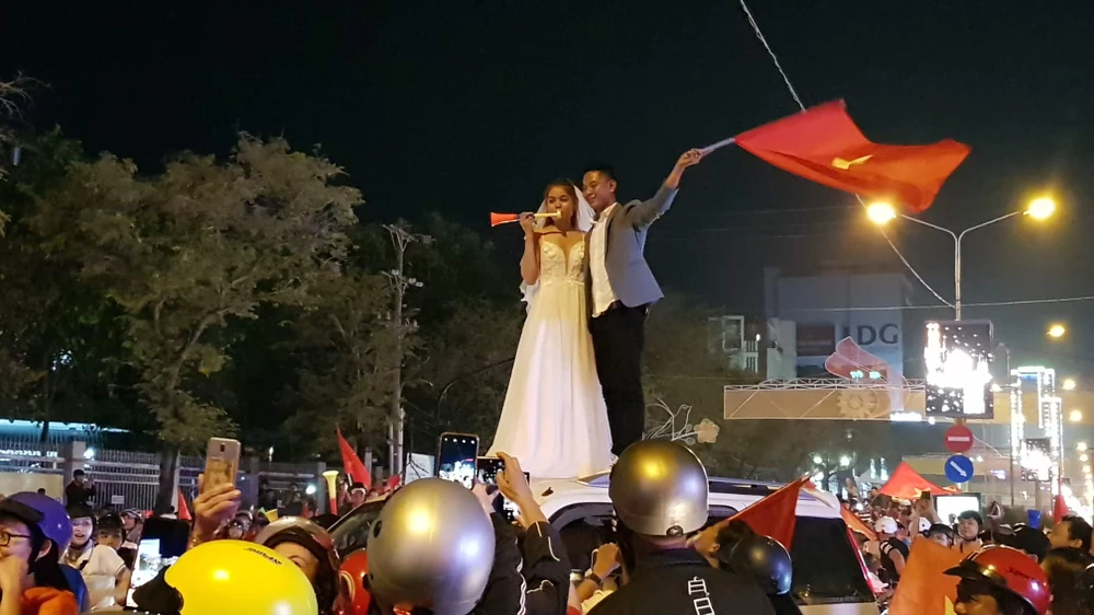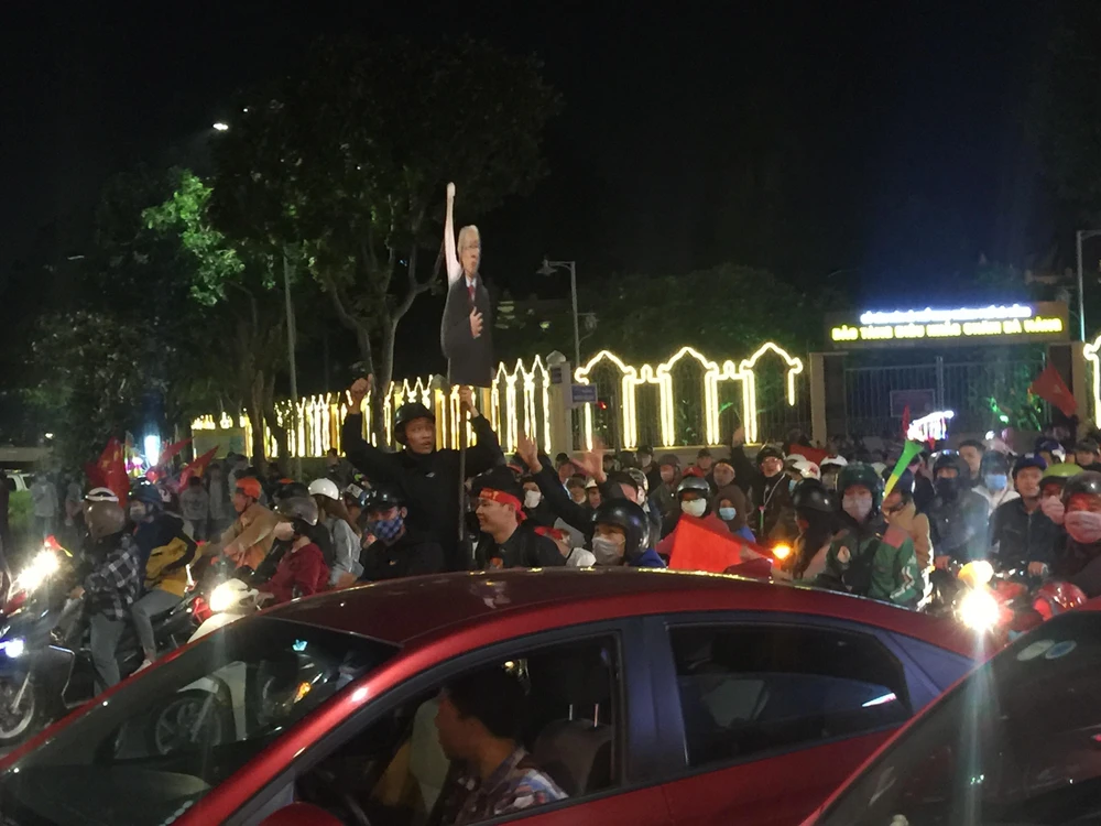 Người dân Cần Thơ bắt đầu đổ xuống đường ngay sau tiếng còi kết thúc trận đấu. Ảnh: HẢI DƯƠNG