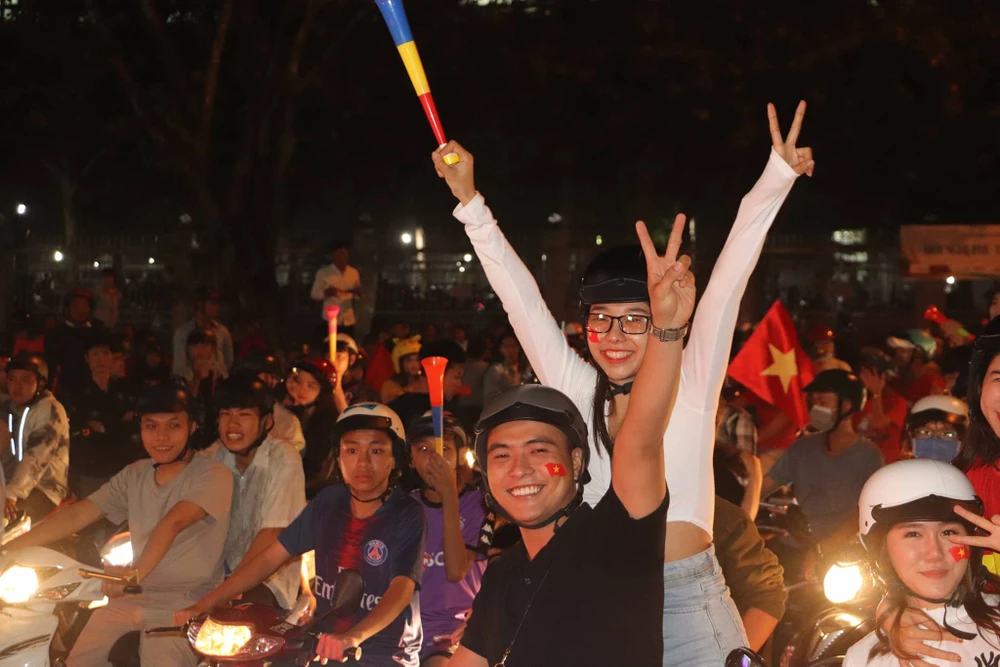 Tại đầu cầu TP.HCM, người hâm mộ vẫn đang tập trung nhiều trên phố đi bộ Nguyễn Huệ để ăn mừng, chụp ảnh lưu niệm. Ảnh: HOÀNG GIANG