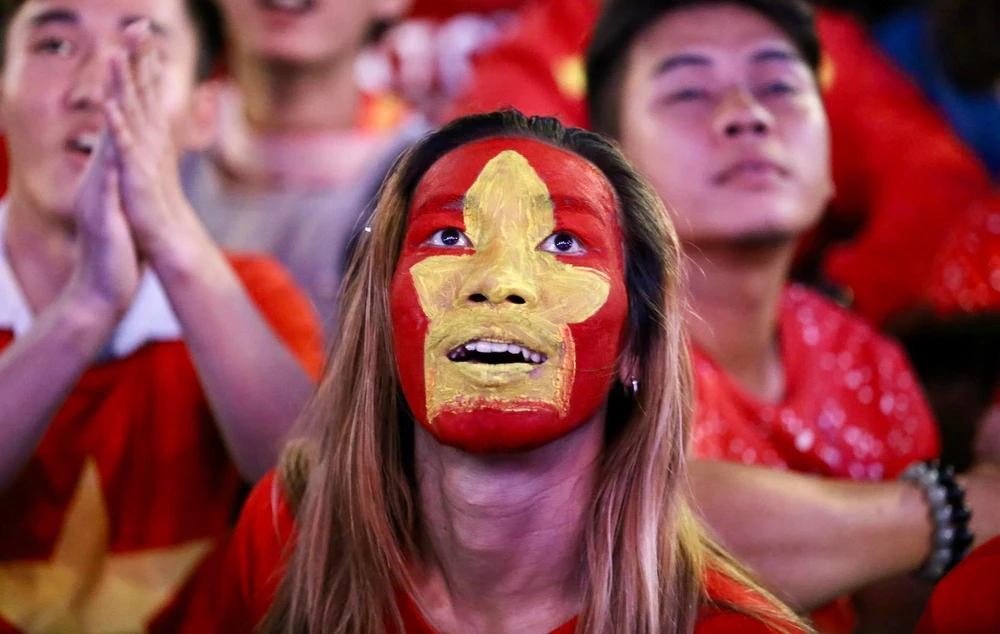 Nhiều người bạn nước ngoài cũng mặc sắc áo đỏ ủng hộ đội tuyển Việt Nam. Ảnh: HOÀNG GIANG