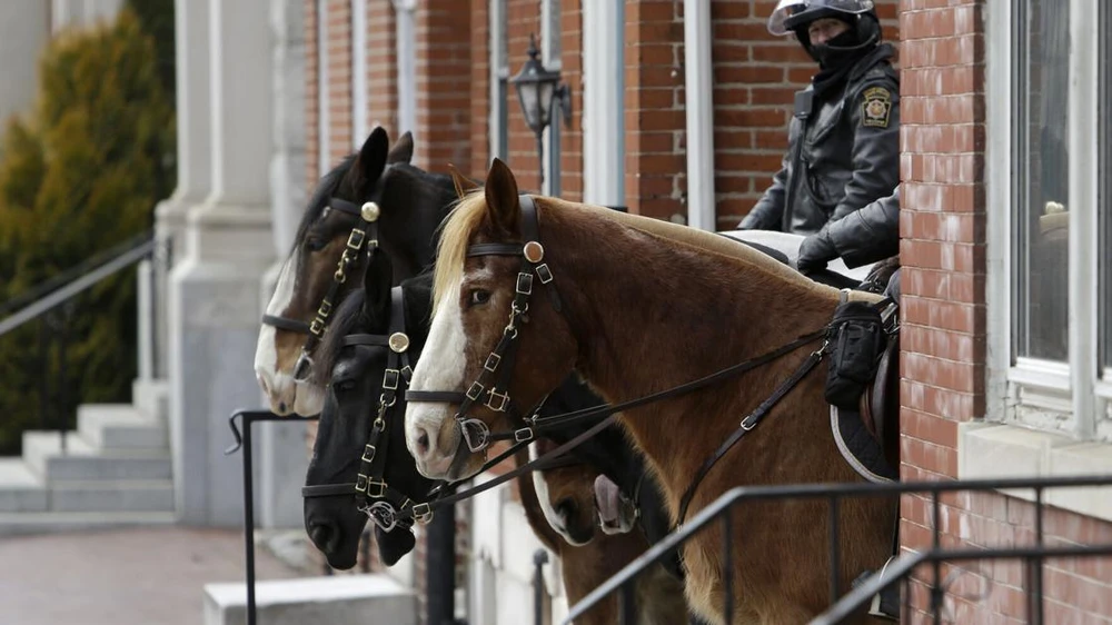 Cảnh sát bang Pennsylvania trên lưng ngựa được bố trí trong một con hẻm gần Tòa nhà Hội đồng bang Pennsylvania vào ngày 17-1. Ảnh: AP