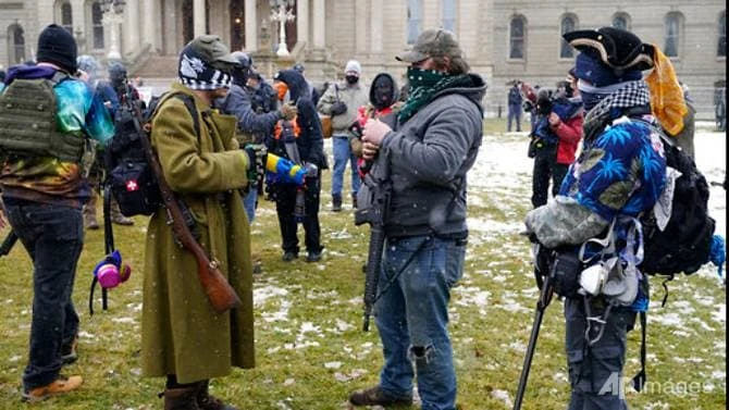 Nhóm vũ trang đứng bên ngoài tòa nhà Hội đồng bang Michigan ở Lansing vào ngày 17-1. Ảnh: AP