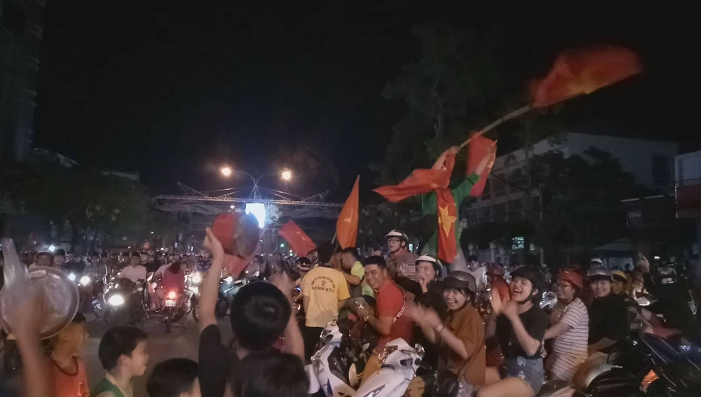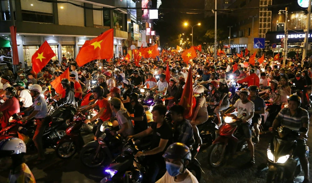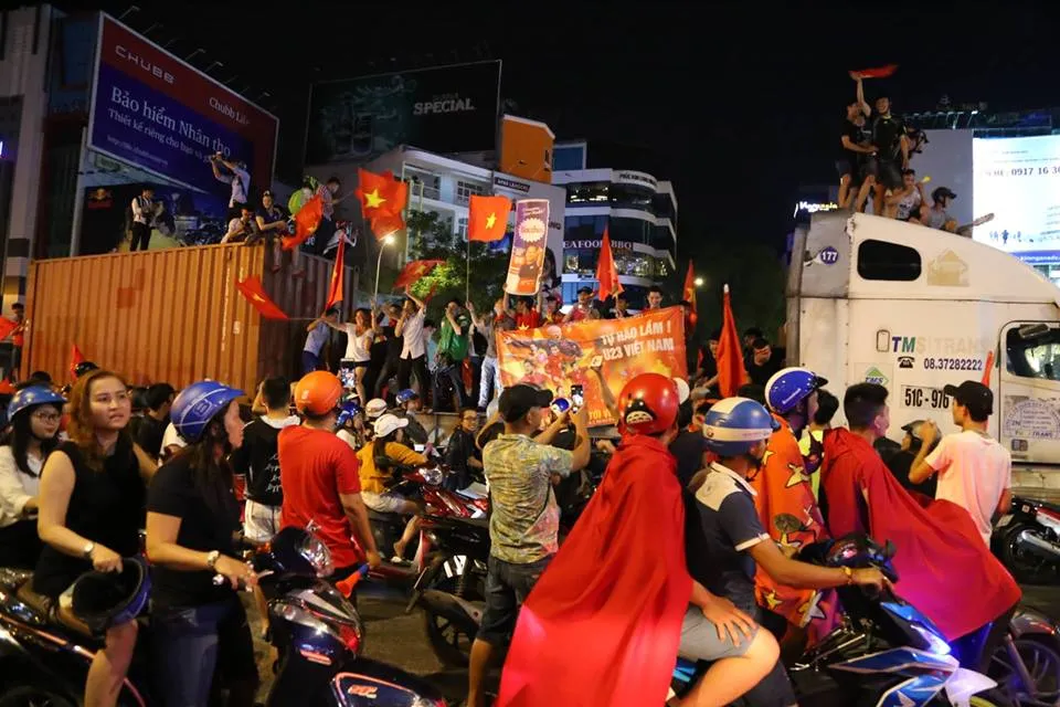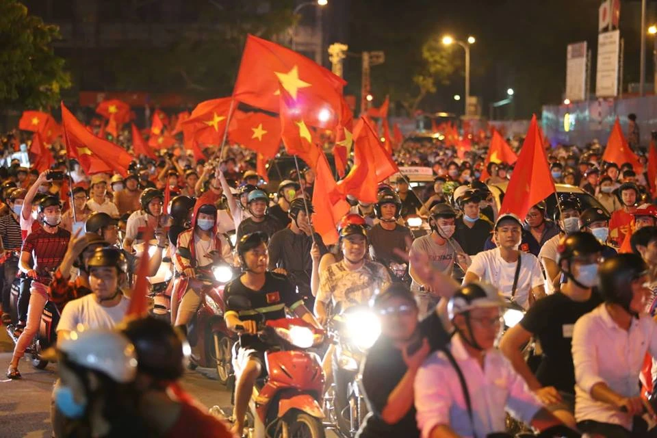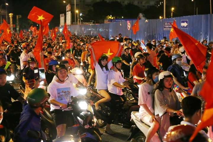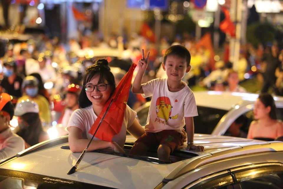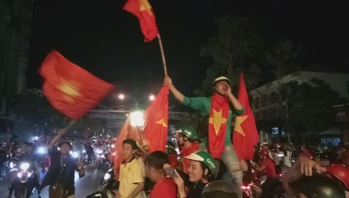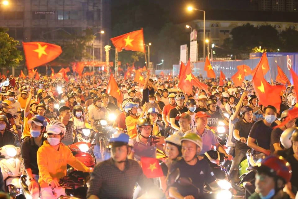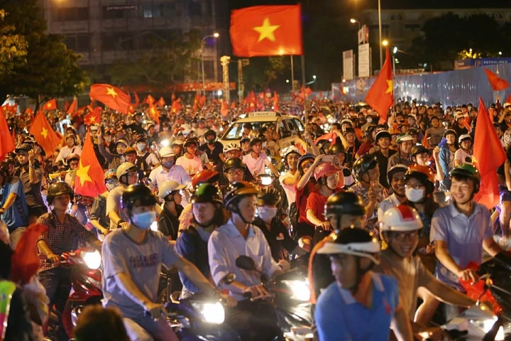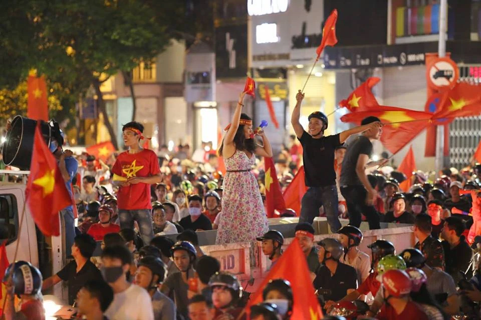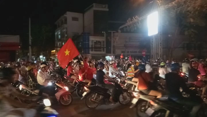 Dọc tuyến đường 30/4 và đại lộ Hòa Bình, từng dòng xe nối đuôi nhau, đường phố về khuya như bùng nổ theo chiến thắng của Việt Nam. Lá cờ đỏ sao vàng tung bay khắp nơi, tiếng kèn trống rền vang cả một vùng trời.