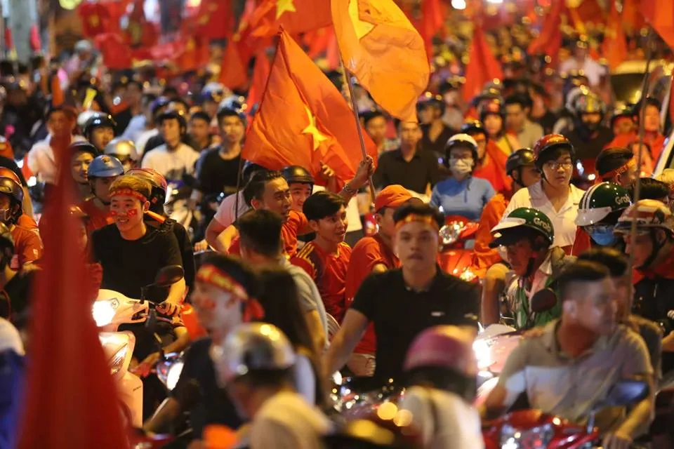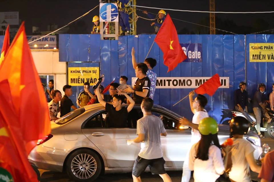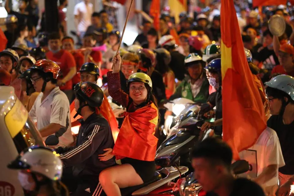 Hà Nội: Tại khu vực Hồ Gươm, hàng ngàn người hâm mộ đã xuống đường ăn mừng với cờ đỏ rực rỡ, dòng người và xe di chuyển chậm qua từng tuyến phố.