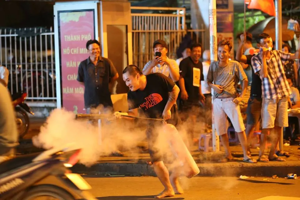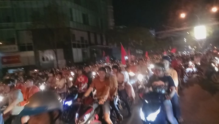 Hải Phòng:Đường Lạch Tray, Hải Phòng kẹt cứng trước dòng người diễu hành ăn mừng chiến thắng. Cả một góc phố pháo sáng đốt sáng rực.