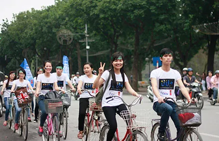 Giới trẻ Hà Nội đạp xe hưởng ứng Giờ Trái đất 2014 trong ngày 29-3. Ảnh: TRÀ PHƯƠNG