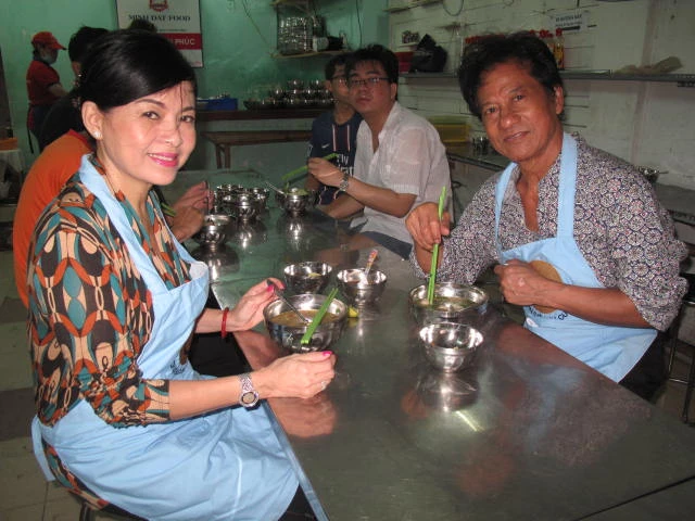 10g kém 10 phút nhà báo Nam Đồng đề nghị chấm dứt chuyện phỏng vấn, chụp hình để mọi người tập trung phục vụ khách. Vậy là ca sĩ Chế Linh cùng vợ đeo tạp dề vào làm việc không ngơi tay. Ông phát bún, bà phát đũa không ngừng nghỉ cho gần 600 thực khách ra vào liên tục trong không gian chật hẹp, nóng bức vì quá đông người của quán.