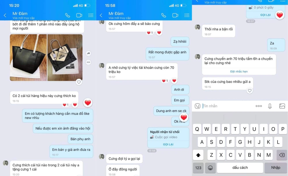 Chị V. hâm mộ Đàm Vĩnh Hưng từ những ngày còn thơ bé. Hơn 20 năm thần tượng, một ngày chị thấy một tài khoản zalo có tên Mr Đàm vào kết bạn. Người này còn chủ động gọi nói chuyện, chị bắt máy chỉ nghe đầu kia “Alo” chị nhận ra ngay đó là giọng ca sĩ mình mến mộ. Khi cúp máy, zalo “Mr Đàm” này nhắn tin chị: “ Em ơi chiều nay anh thanh lý đồ hiệu, em xem ủng hộ giúp anh với nha”.