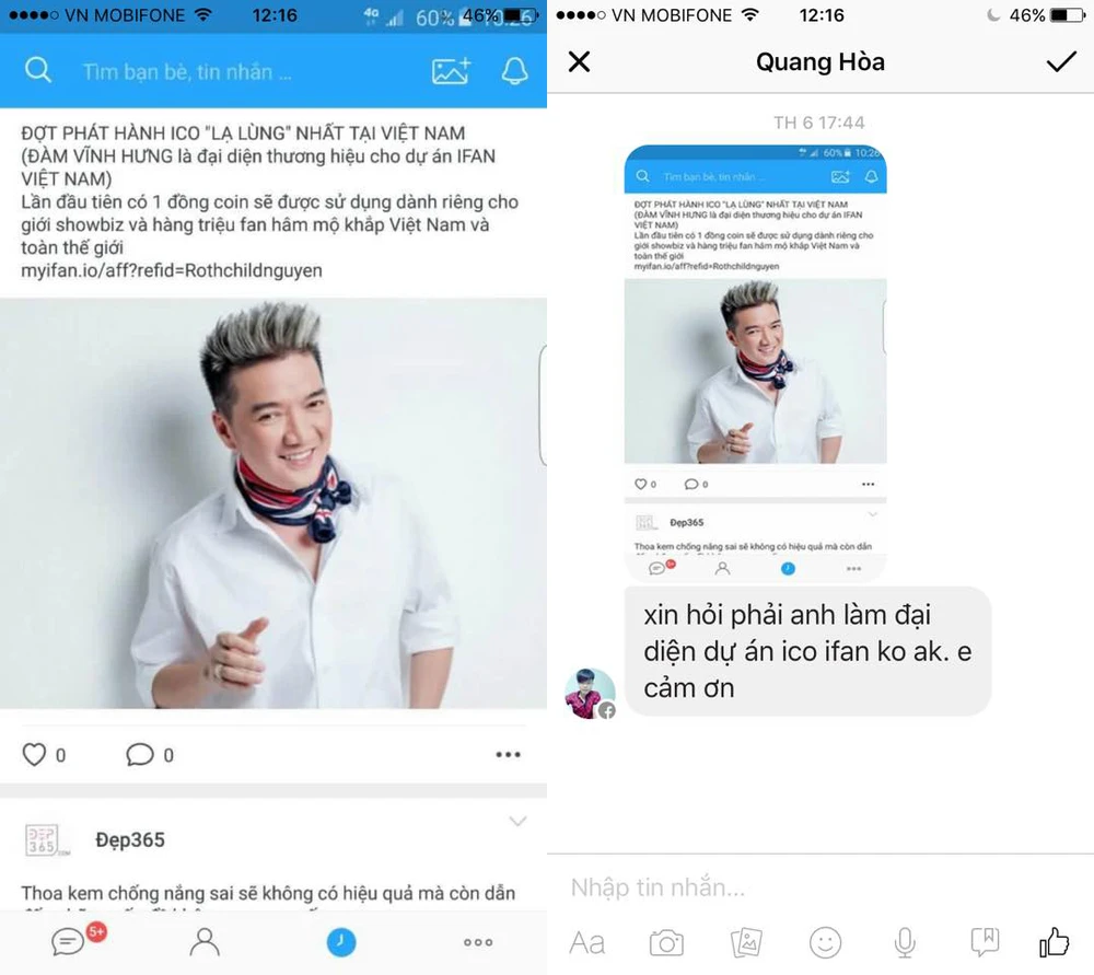 Cụ thể, Đàm Vĩnh Hưng đã chia sẻ trên fanpage như sau: “Hiện nay, đang có một số kẻ xấu ganh tị với ĐVH hoặc cũng có thể là đối thủ của tập đoàn ifan nào đó đã dựng chuyện và cố tình gán ghép cho Hưng với vai trò đại diện hay quảng cáo, PR cho đa cấp hay huy động vốn gì đó! Việc này có thể làm mất uy tín của ĐVH đối với đồng nghiệp và các đối tác khác.