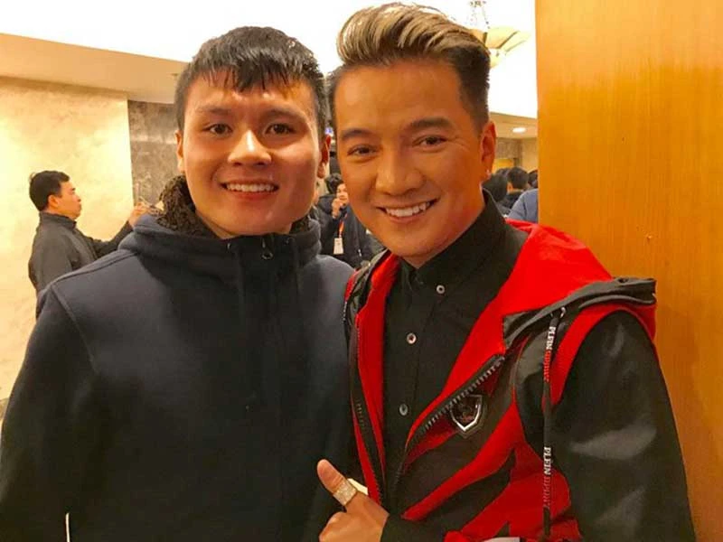 Ca sĩ Đàm Vĩnh Hưng và tiền vệ Quang Hải trong lần hủy các show diễn để hát mừng U-23 Việt Nam. Ảnh: VNNEWS