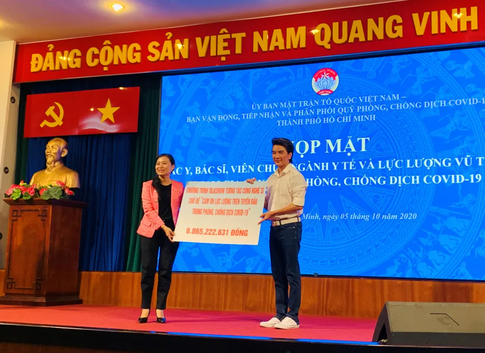 Sáng 5-10, ca sĩ Đàm Vĩnh Hưng đã đại diện chương trình Talkshow tương tác cùng nghệ sĩ với chủ đề “Cảm ơn những tuyến đầu trong phòng, chống dịch COVID-19” trao bảng tượng trưng ủng hộ gần 7 tỷ đồng cho đại diện Uỷ ban Mặt trận Tổ quốc Việt Nam TP.HCM tại buổi họp mặt tri ân các y bác sỹ, lực lượng vũ trang nhân dân tham gia phòng, chống dịch COVID-19.