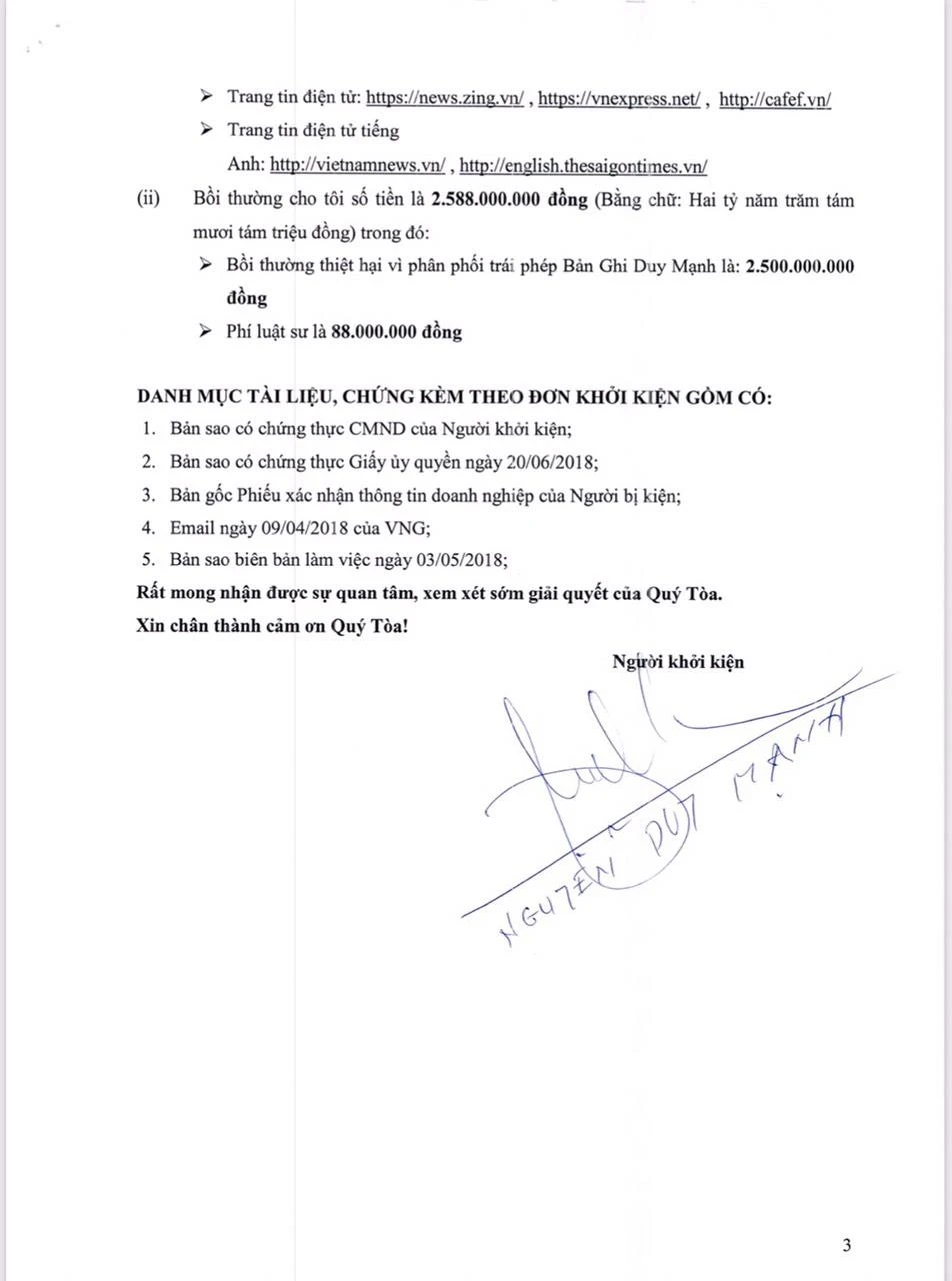 “Dù đã thể hiện thiện chí và mong muốn được thỏa thuận trả tiền tác quyền âm nhạc tương xứng nhưng phía Zing Mp3 không chấp nhận nên tôi muốn kiện đến cùng để đòi Zing Mp3 trả 2,5 tỉ đồng bằng tiền mặt” - ca sĩ Duy Mạnh nói.
