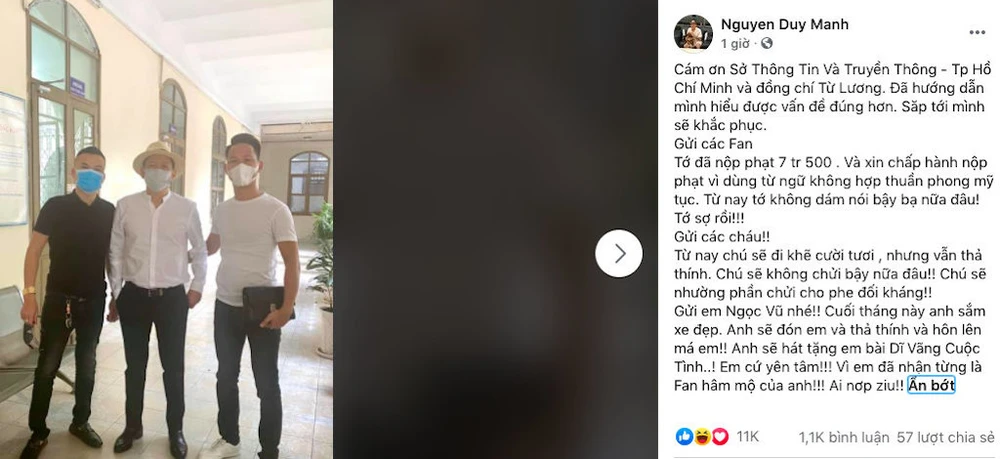 “Anh Duy Mạnh đã vi phạm Điểm b, Khoản 1, Điều 101 Nghị định 15/2020 (Nghị định Quy định xử phạt vi phạm hành chính trong lĩnh vực bưu chính, viễn thông, tần số vô tuyến điện, công nghệ thông tin và giao dịch điện tử) về hành vi cung cấp thông tin không phù hợp với thuần phong mỹ tục của dân tộc trên mạng xã hội”, ông Nguyễn Đức Thọ, Chánh thanh tra Sở Thông tin và Truyền thông TP.HCM, cho biết.