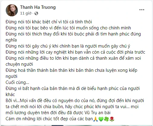 Bên cạnh đó, ca sĩ Thanh Hà cũng cho rằng mọi vấn vấn đề đề có nguyên do của nó. "Đừng đợi đến khi người ta chết mới nói lời chia buồn, hãy chúc phúc khi người ta vui… mọi mối lương duyên trên đời đều đã được Vũ Trụ an bài"- nữ ca sĩ khẳng định.