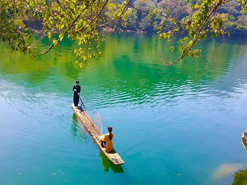Ca sĩ Kiwi Ngô Mai Trang trên thuyền độc mộc quay ở hồ Ba Bể trong ca khúc Bến xuân. Ảnh: Nhân vật cung cấp