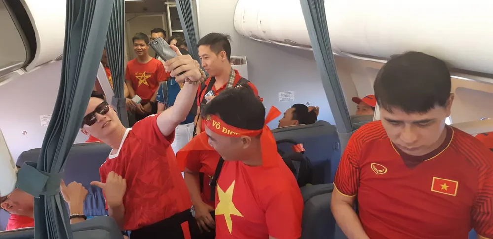 Một số hình ảnh ca sĩ Hoàng Bách và đạo diễn Trọng Trinh trên chuyến bay cổ vũ đội tuyển:
