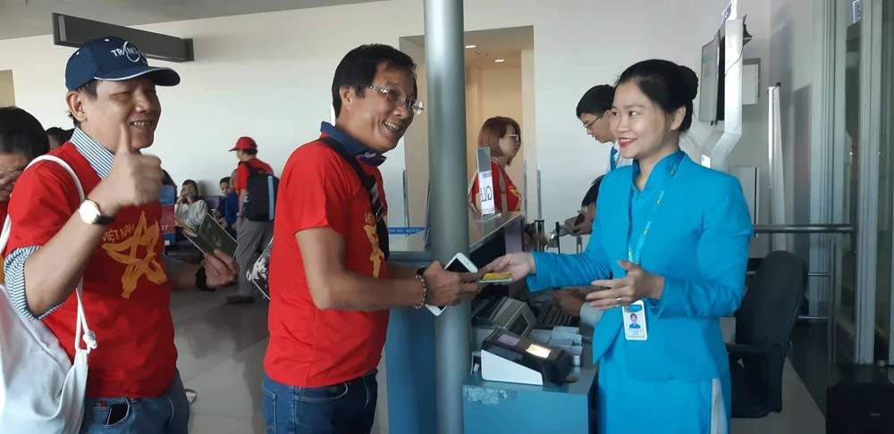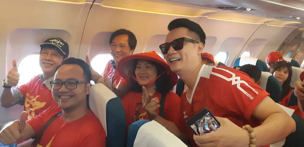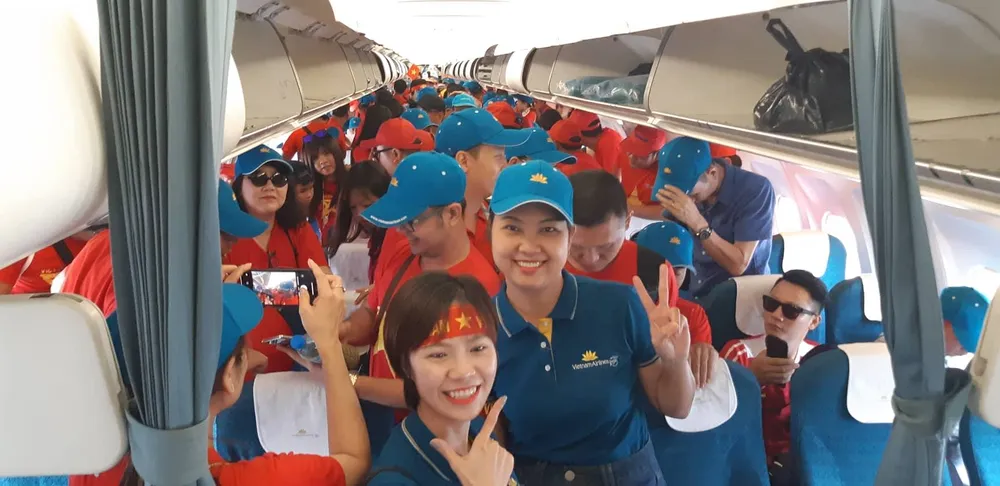 Đáng chú ý, các tiếp viên trên chuyến bay cũng mang áo thun đỏ, quần jean hòa cùng sắc đỏ của cổ động viên trên chuyến bay. Đồng hành cùng cổ động viên, thay mặt Vietnam Airlines, các tiếp viên tặng mỗi cổ động viên một chiếc nón màu xanh truyền thống của hãng để ra sân cổ vũ Olympic Việt Nam thi đấu với Hàn Quốc vào 16 giờ chiều nay (29-8).