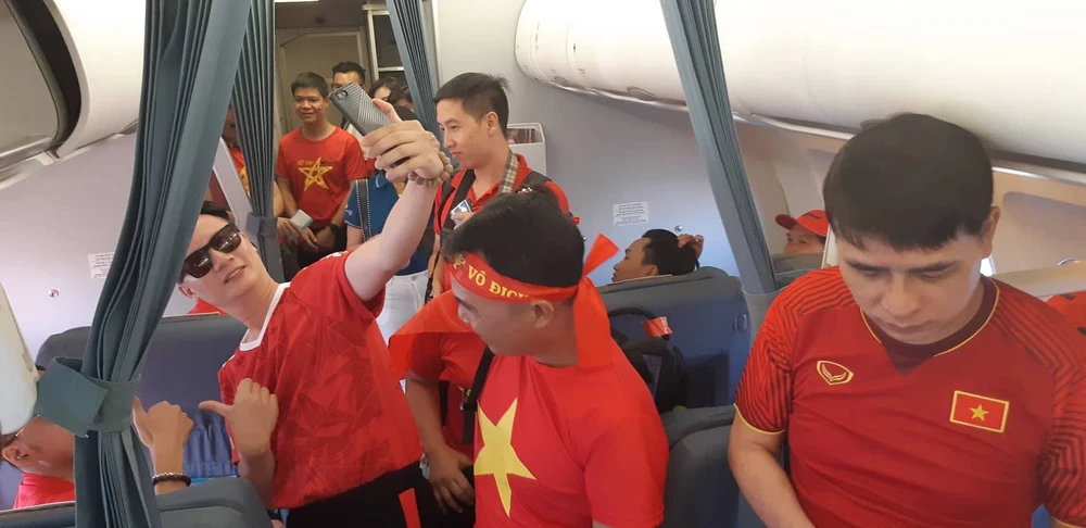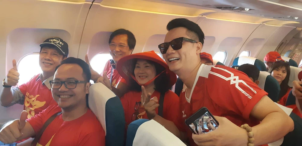 Vừa lên máy bay, nam ca sĩ có màn hoạt náo gây phấn khích cho cổ động viên bằng màn hô to Việt Nam vô địch, rồi cùng cổ động viên quay video, chụp ảnh "tự sướng". Sau màn chào sân này, trong ba giờ bay các cổ động viên liên tục hò hát, chụp ảnh, hô khẩu hiệu Việt Nam vô địch thể hiện tình cảm với đội tuyển Olympic Việt Nam.