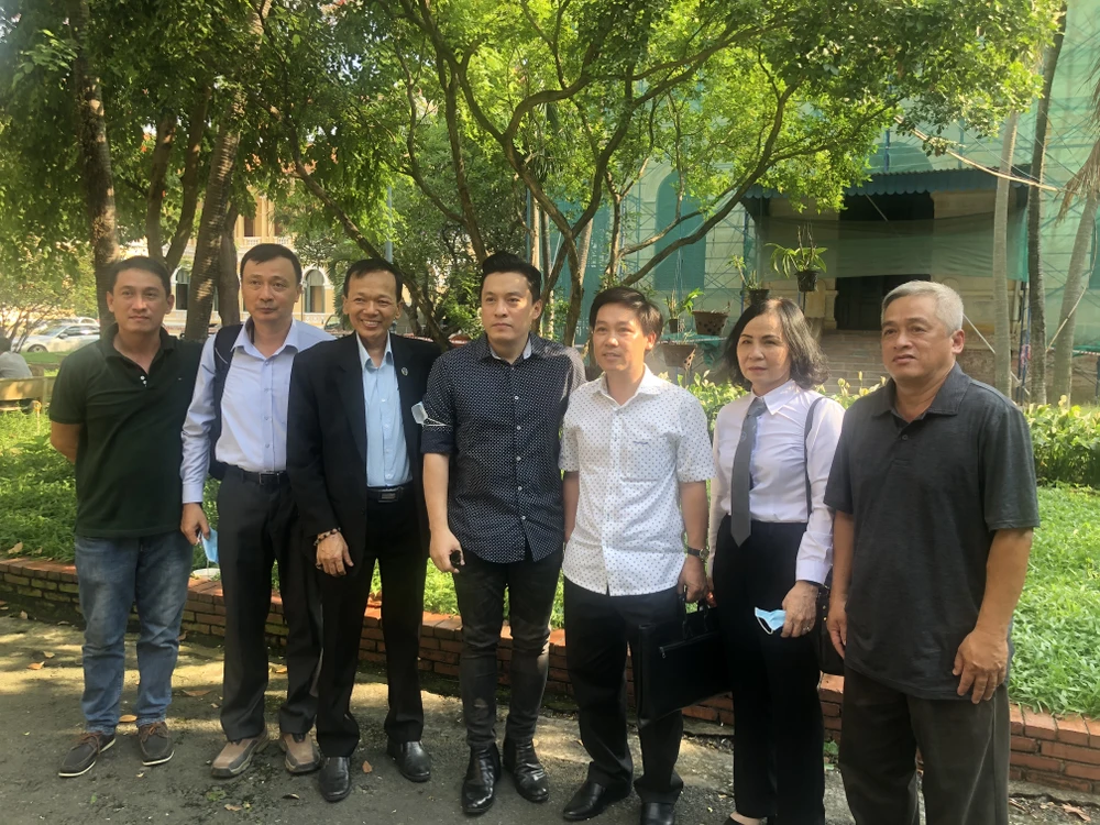 Ca sĩ Lam Trường (giữa) vui mừng cùng mọi người sau kết quả phiên xử. Ảnh: HOÀNG YẾN