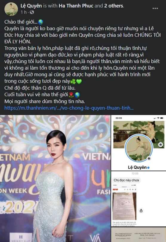 Lệ Quyên đã chính thức công khai ly hôn trên trang cá nhân của mình. Ảnh: LỆ QUYÊN