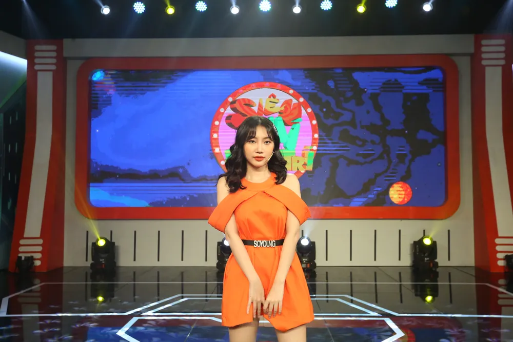 Xuất hiện trên sân khấu, có lẽ sợ khán giả không nhận ra mình nên nữ ca sĩ Orange đã diện nguyên một bộ đầm màu cam nổi bật đúng như nghệ danh của mình.