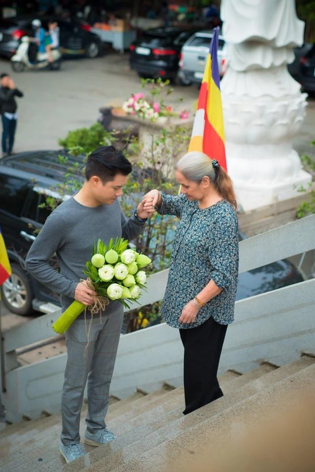 Ca sĩ Quang Dũng cùng mẹ đến chùa Vĩnh Nghiêm (TP.HCM).