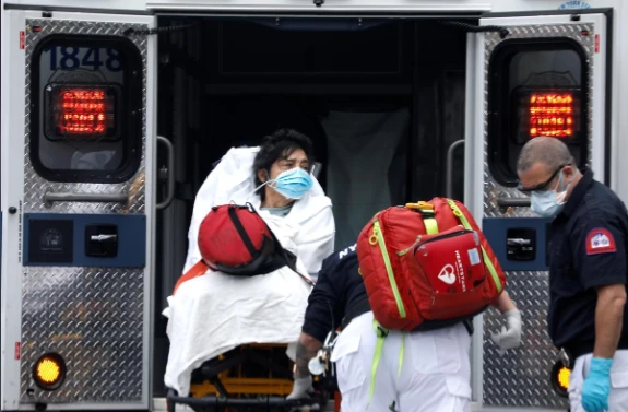 Một phụ nữ nhiễm COVID-19 được đưa vào xe cứu thương ở New York, Mỹ. Ảnh: REUTERS