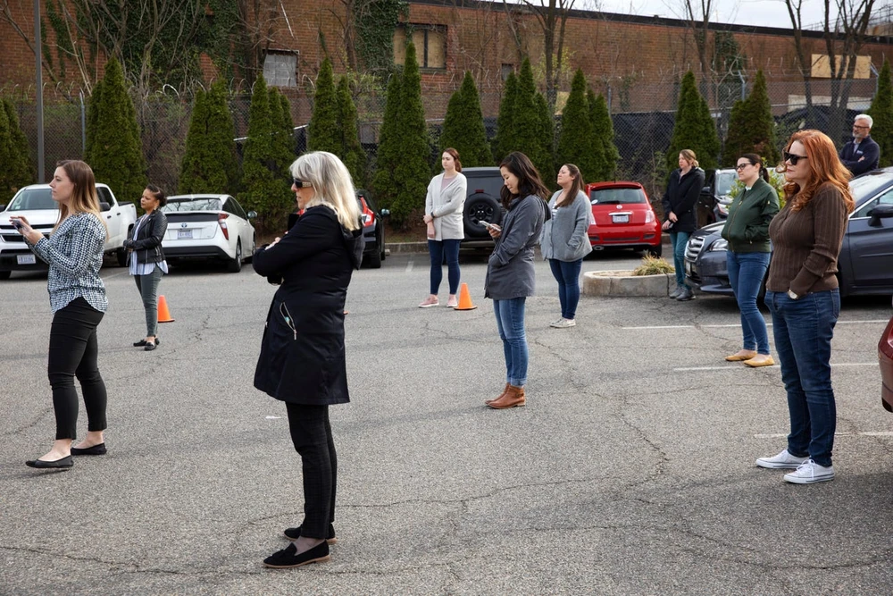 Người dân đứng giãn ra khi nghe Thị trưởng TP Washington DC Muriel Bowser thông báo về cách ứng phó COVID-19 của TP. Ảnh: AP