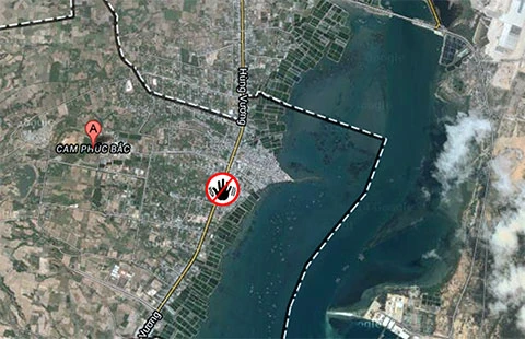 Vị trí người dân chặn quốc lộ 1A đoạn trước UBND phường Cam Phúc Bắc, TP Cam Ranh (Khánh Hòa). Đồ họa: PN