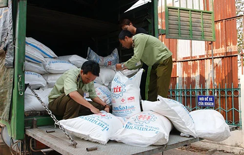 Cán bộ QLTT đang kiểm tra số đường bị bắt giữ. Ảnh: TAnh