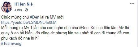 Ủng hộ sản phẩm âm nhạc mới của rapper Đen Vâu, Hoa hậu H'Hen Niê đã chia sẻ MV này và viết rằng chúc mừng chú Đen lại ra MV mới. Mỗi tháng ra MV một lần cho con nghe nha chú Đen. Không có tiền làm MV thì quay ở ao hồ biển gì đó cũng được nhưng lần sau nhớ rủ con đi chung để con phụ xách đồ nha. Điều khiến nhiều người chú ý là cách xưng hô của Hoa hậu Hoàn vũ Việt Nam 2017 với Đen Vâu. Dù chỉ kém nam rapper 3 tuổi nhưng H'Hen Niê lại xưng con, gọi Đen Vâu là chú.