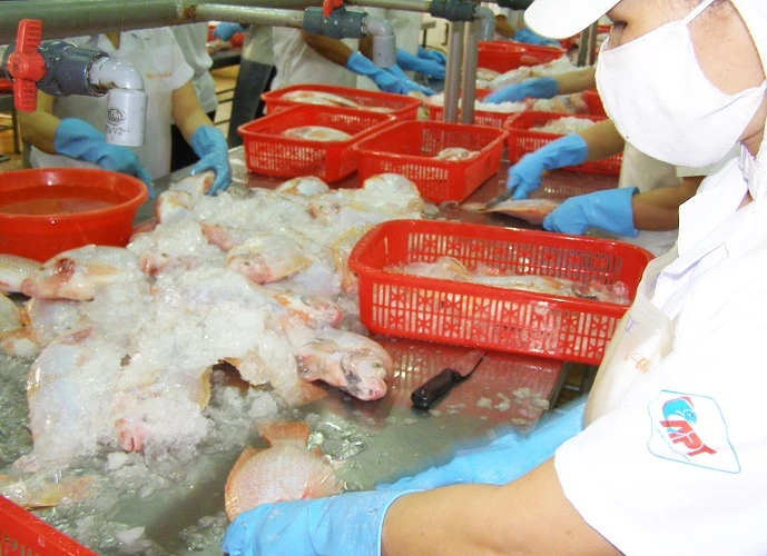 Công nhân Công ty CP Kinh doanh thủy hải sản Sài Gòn đang sơ chế cá điêu hồng. Ảnh: TRẦN NGỌC