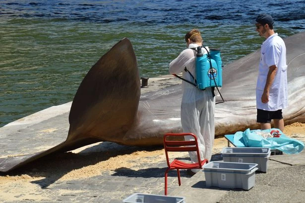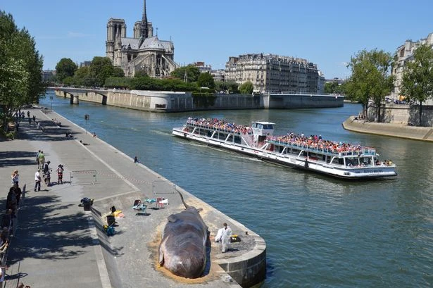 Chú cá voi trông như đã chết bên bờ sông Seine giữa thủ đô Paris. Ảnh: NEWZULU