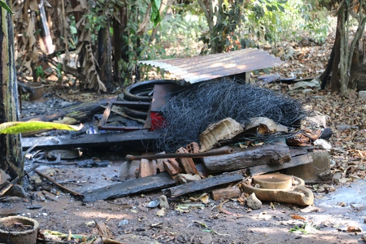 Hai người đã cào rác thành từng đống nhỏ rồi đốt. Khi đốt xong hai đống rác gồm lá cây và que củi, anh Phi đi chặt cây chuối, còn ông Hùng thì quay sang đốt đống rác do gia chủ gom lại từ trước (gồm các loại như lốp xe, cửa gỗ, bùi nhùi…).