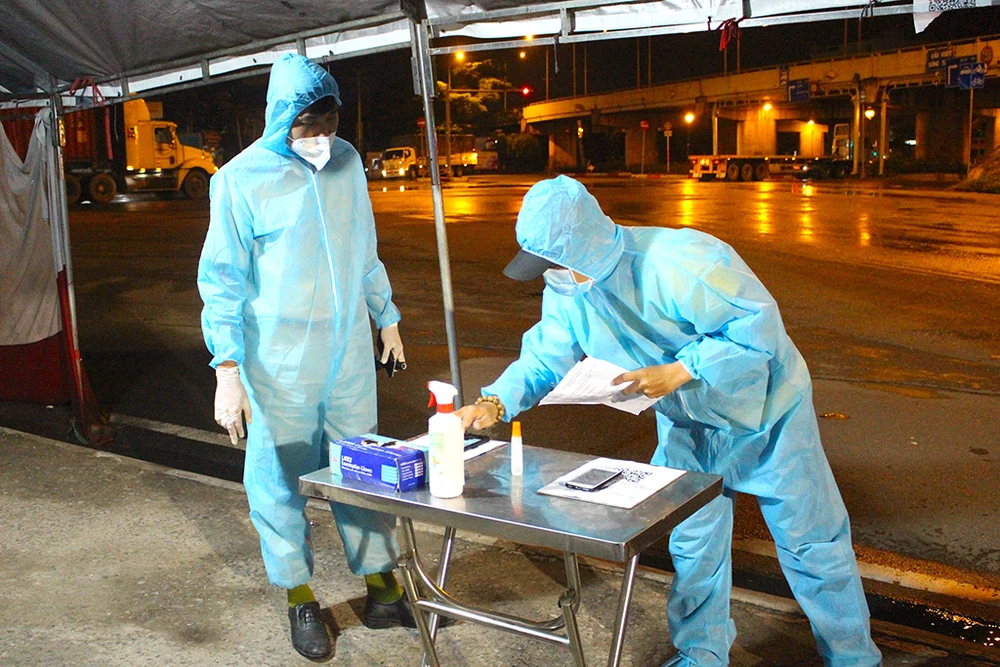 CSGT TP.HCM trong bộ đồ bảo hộ tại chốt kiểm soát quốc lộ 1 - KCN Sóng Thần đang kiểm tra di biến động của một trường hợp qua chốt vào buổi tối. Ảnh: LÊ THOA