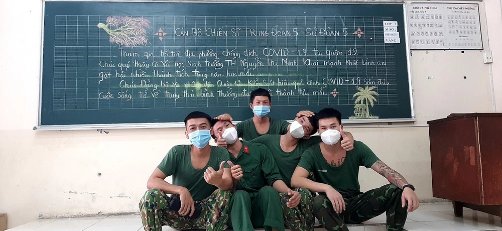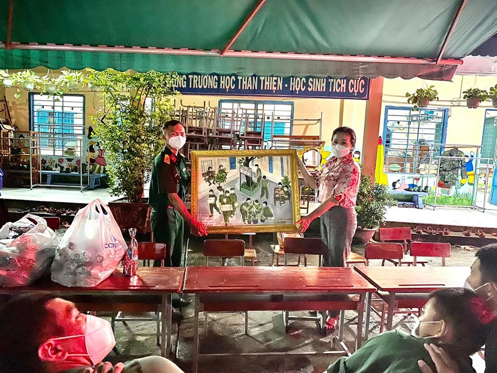 Cô Lý Thị Mỹ Phượng kể: “Khi các anh đến thì khu vực trường đỏ dịch, các thầy cô thực hiện chỉ thị 16 nên không đi đón các anh được. Tôi chỉ quan sát qua camera hoặc hình ảnh bảo vệ chụp gửi về. Sáng các anh ra khỏi trường chiều tối mới về. Hơn nữa, cũng có anh trong lúc hỗ trợ giúp dân bị nhiễm cũng ở cách ly tại trường. Vì vậy, mọi liên lạc đều qua điện thoại hoặc bảo vệ trường. Tới ngày biết tin rút quân, tình hình dịch ở khu vực cũng tạm ổn nên tôi mới sắp xếp vào tiễn các anh”.