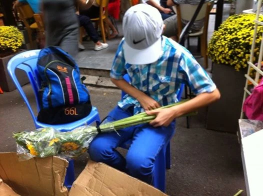 Một cậu bé theo mẹ ra đường hoa giúp mẹ bó hoa, giao hàng.
