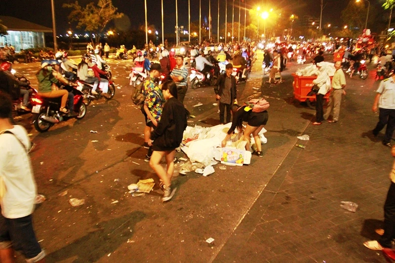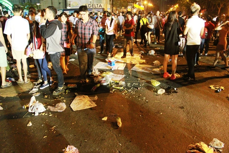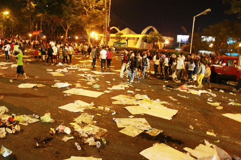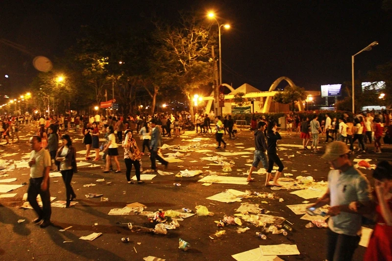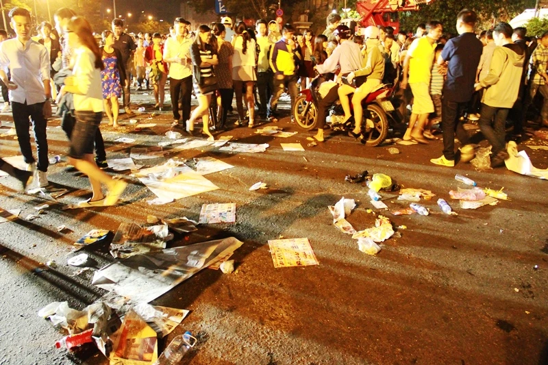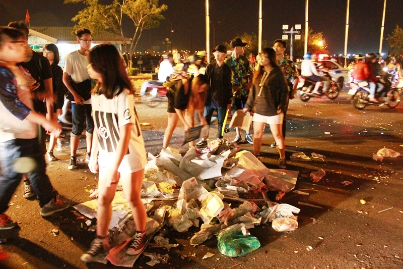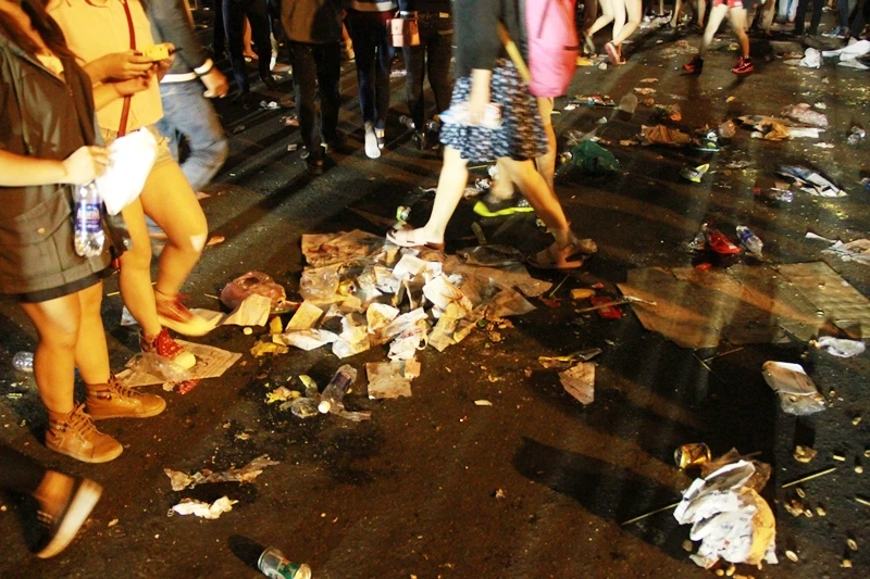 Khu vực người dân đứng xem pháo hoa chẳng khác gì một "bãi chiến trường" đầy rác.